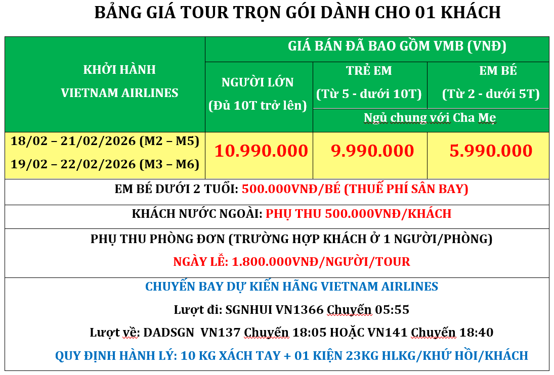 + Trẻ em dưới 02 tuổi: 500.000đ phí hàng không. Cha, Mẹ hoặc người thân đi kèm tự lo các chi phí ăn, ngủ, tham quan (nếu có) cho bé.