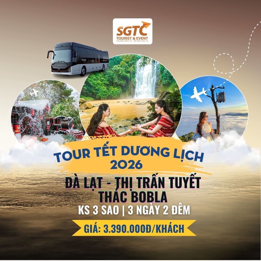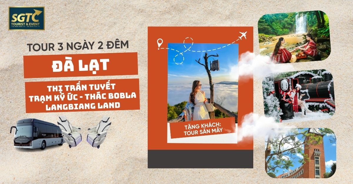 Tour Đà Lạt 3 ngày 2 đêm mang đến hành trình nghỉ dưỡng trọn vẹn với những điểm tham quan mới lạ 2025 như Thác Bobla, Langbiang Land, Thị trấn tuyết Iyashi, Que Garden, Cafe Trạm Ký Ức và Quảng trường Lâm Viên. Du khách thưởng thức ẩm thực hấp dẫn với tiệc BBQ nướng và Buffet rau Leguda, di chuyển bằng xe Limousine VIP 20–28 ghế, lưu trú khách sạn 3 sao trung tâm Đà Lạt. Dịch vụ chu đáo – tận tâm hứa hẹn mang đến một chuyến tour Đà Lạt 3N2Đ nhiều trải nghiệm và kỷ niệm đáng nhớ.