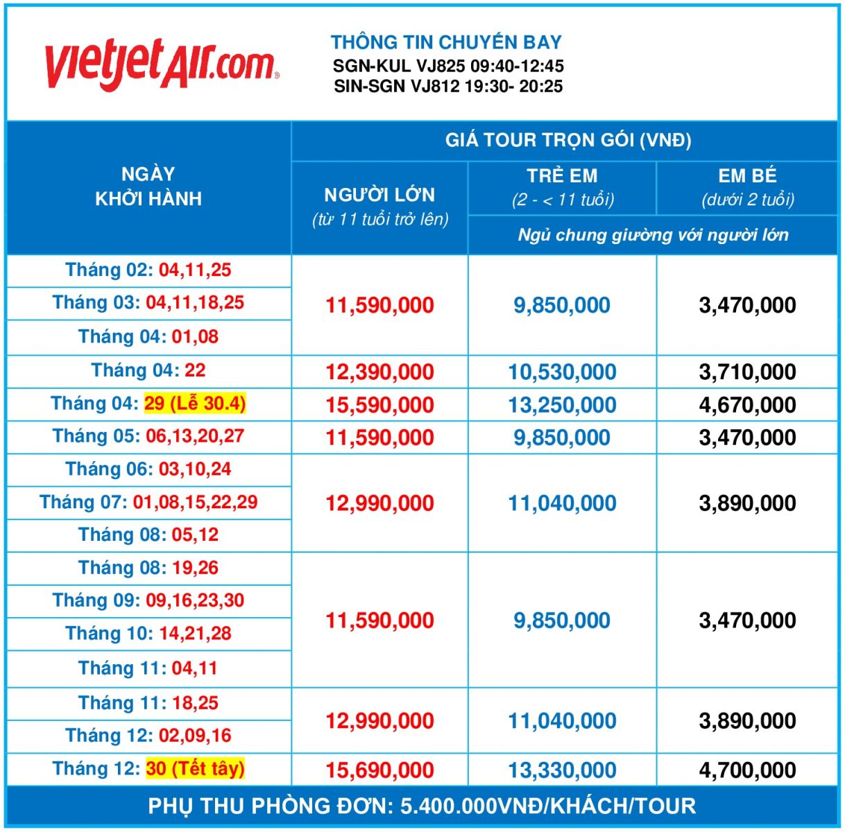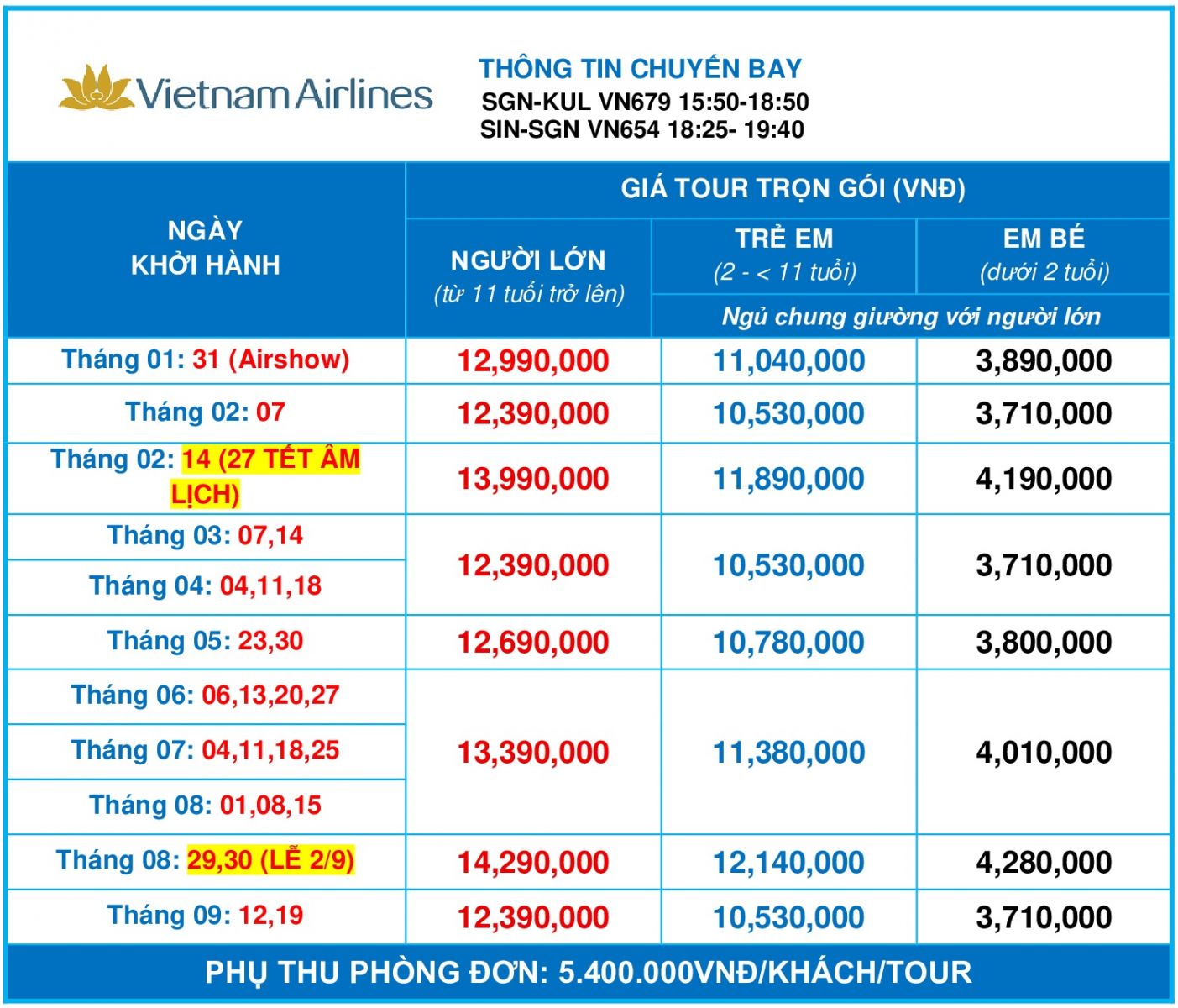 2. Phụ thu phòng đơn 5.400.000VND/Khách/Tour