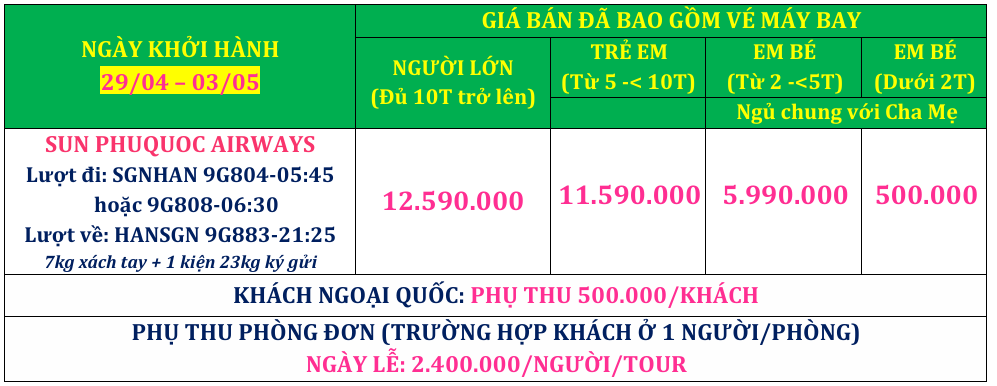 + Dưới 02 tuổi: 500.000đ/bé (Phí thủ tục hàng không). Hai người lớn chỉ được kèm theo 01 trẻ, từ trẻ thứ hai tính theo gói trẻ em 5t trở lên.