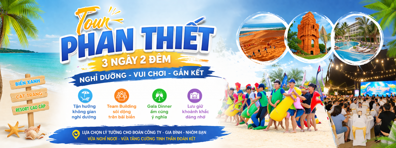 Tour Team Building Mũi Né – Phan Thiết của Sài Gòn Thành Công Tourist & Event được thiết kế riêng theo yêu cầu, kết hợp hoạt động gắn kết, Gala Dinner sôi động và nhiều quà tặng hấp dẫn – mang đến trải nghiệm trọn vẹn, đáng nhớ.
