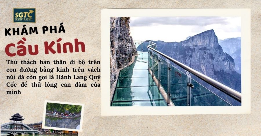 + Sạn Đạo Kính – Thử thách bản thân đi bộ trên con đường bằng kính trên vách núi đá còn gọi là Hành Lang Quỷ Cốc để thử lòng can đảm của mình. Quý khách trải nghiệm hệ thống thang cuốn đồ sộ trong lòng núi để đến Cổng Trời - nơi giao thoa giữa trời và đất. Sau khi đi qua Sạn Đạo Kính sẽ đến Vườn cây Củng Đồng , một loại cây đã bị tuyệt chủng được lưu giữ và gây dựng lại trên đỉnh Thiên Môn Sơn, tương truyền đây là Vườn Ước Nguyện, tại đây mỗi người viết điều ước của mình lên mảnh vải đỏ và treo lên cây thì điều ước của mình sẽ thành hiện thực.