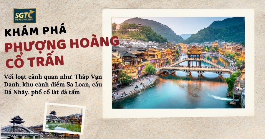 + Phượng Hoàng Cổ Trấn với loạt cảnh quan như: Tháp Vạn Danh, khu cảnh điểm Sa Loan, cầu Đá Nhảy, phổ cổ lát đá tấm… Tự do tham quan và khám phá Phượng Hoàng Cổ Trấn với các món ăn địa phương. Quý khách ghi lại những bức hình đẹp nhất tại cổ trấn 1300 năm hình thành và phát triển, khám phá một bảo tàng sống về văn hóa của các dân tộc; cũng như ngắm nhìn những thành quách, những dãy phố, những căn nhà cổ, gia trang, văn miếu, đền chùa đậm dấu ấn của người Trung Quốc. Đây cũng là nơi nét đẹp của văn hóa dân tộc Trung Hoa chảy qua và để lại những giá trị truyền thống đẹp đẽ nhất. Hơn cả, Phượng Hoàng Cổ Trấn còn hút hồn du khách ngay từ ánh nhìn đầu tiên đến khi rời bước bởi cảnh sắc hoa lệ, đẹp như một bức tranh thủy mặc.