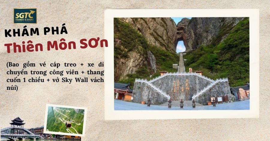 + Công viên quốc gia Thiên Môn Sơn (Bao gồm vé cáp treo + xe di chuyển trong công viên + thang cuốn 1 chiều + vớ Sky Wall vách núi) – trải nghiệm “tuyến cáp treo dài nhất tại một ngọn núi cao nhất trên thế giới với 98 cabin, dài 7.400 mét, cao 1.279 mét. Từ cáp treo quý khách có thể ngắm toàn cảnh thị trấn và cảnh rừng núi nguy nga tráng lệ. Tận mắt chiêm ngưỡng cung đường nguy hiểm nhất thế giới với 99 khúc cua ngoạn mục thu nhỏ trong tầm mắt, nơi đây cũng là nơi nhiều lần biểu diễn máy bay xuyên động Thiên Môn và đua nhảy dù quốc tế. Khi lên tới đỉnh của Thiên Môn Sơn, Quý khách sẽ đi theo con đường bao quanh những đỉnh núi, xuyên từ đỉnh núi này sang đỉnh núi khác. Một bên là núi, một bên là mây, thỉnh thoảng có thêm những lá bùa may mắn màu đỏ rực rỡ sẽ khiến Quý khách cảm thấy lạc như lạc vào chốn bồng lai tiên cảnh, như đang đi trên 9 tầng mây của thiên đường.