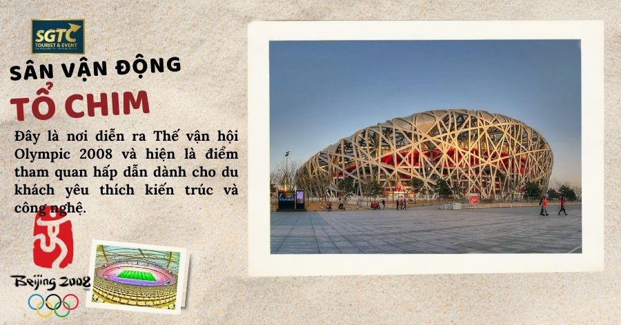 + Buổi chiều, đoàn tham quan chụp ảnh tại Sân Vận Động Tổ Chim – biểu tượng hiện đại của Bắc Kinh – nổi bật với kiến trúc thép đan độc đáo như một chiếc tổ chim khổng lồ. Đây là nơi diễn ra Thế vận hội Olympic 2008 và hiện là điểm tham quan hấp dẫn dành cho du khách yêu thích kiến trúc và công nghệ. Với thiết kế ấn tượng và không gian rộng lớn, Tổ Chim Bắc Kinh là điểm check-in không thể bỏ qua khi khám phá thủ đô Trung Quốc.