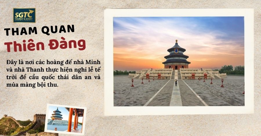 *** Mùa cao điểm, trường hợp không thể tham quan Cố Cung – Xe sẽ đưa quý khách tham quan THIÊN ĐÀN - hay còn gọi là đàn tế trời, là di tích lịch sử này có giá trị văn hóa to lớn. Là đàn lớn nhất trong 4 đàn ở Bắc Kinh, là trung tâm cúng bái của Hoàng Gia. ( Tháng 6 – Tháng 8 )