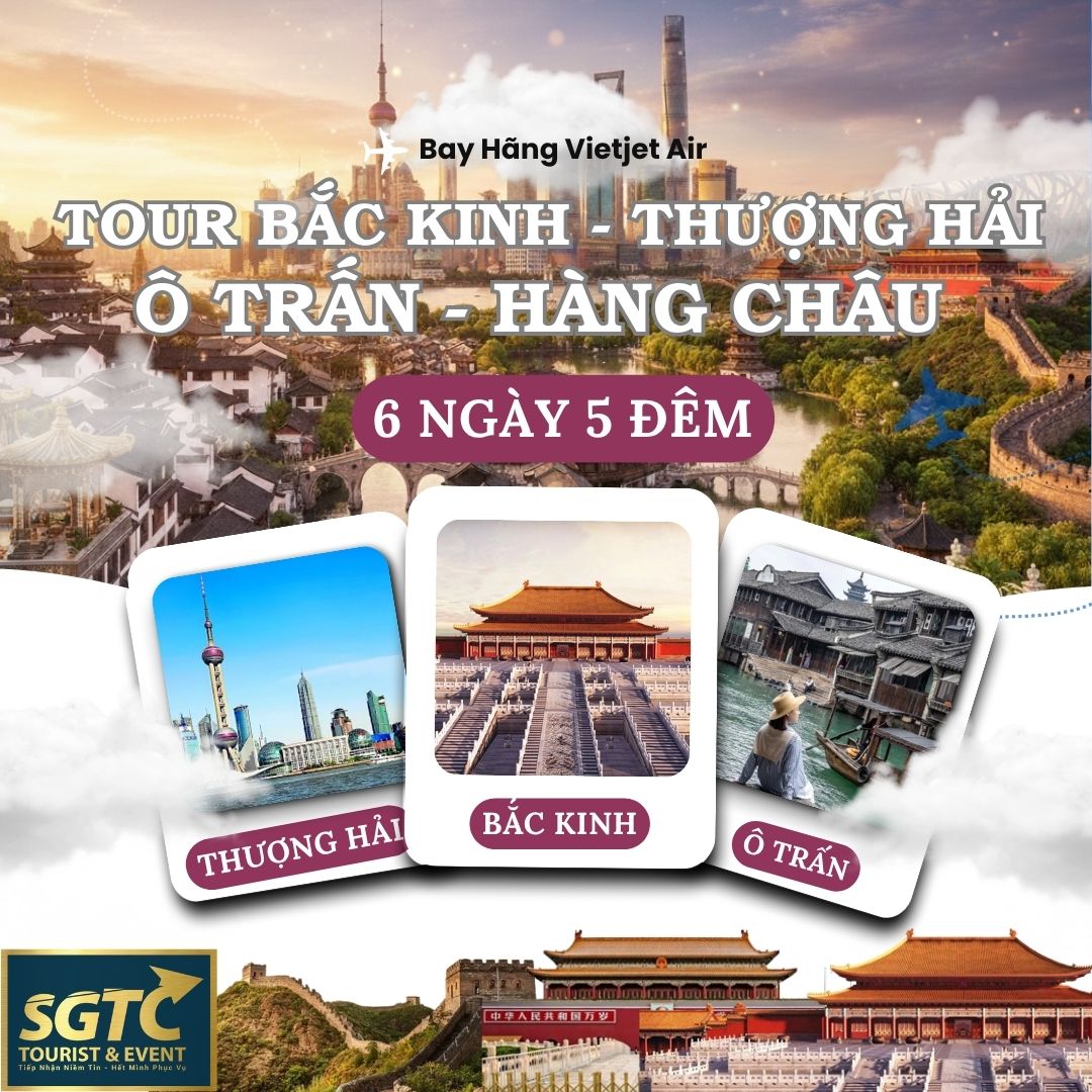 Tour Thượng Hải – Bắc Kinh – Hàng Châu – Ô Trấn (Tổ chức bởi Du Lịch Sài Gòn Thành Công) là hành trình lý tưởng dành cho du khách muốn khám phá trọn vẹn vẻ đẹp hiện đại và cổ kính của Trung Quốc. Tour đưa bạn đến Thượng Hải sôi động, Bắc Kinh giàu giá trị lịch sử, Hàng Châu nên thơ bên hồ Tây nổi tiếng và Ô Trấn – cổ trấn nước tuyệt đẹp với kiến trúc truyền thống được bảo tồn hàng trăm năm. Đây là lựa chọn hoàn hảo cho những ai muốn tìm kiếm tour Trung Quốc chất lượng, lịch trình hấp dẫn và trải nghiệm văn hóa đặc sắc trong cùng một chuyến đi.